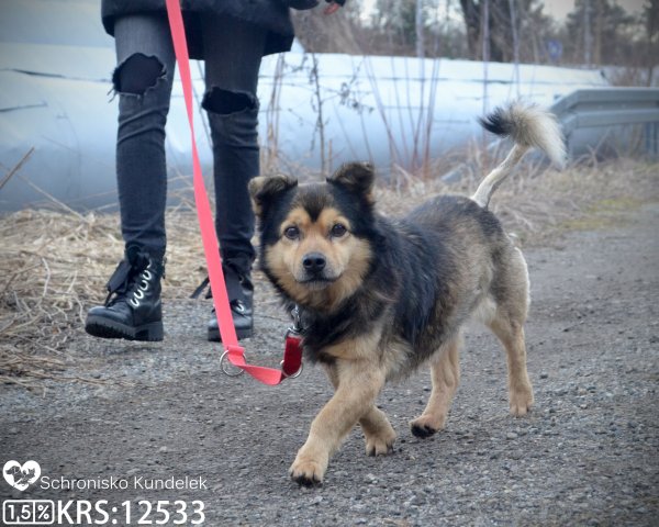Baki trafił do schroniska w roku 2023, mając ok. 10 lat. Jest to przyjazny, nieduży pies.